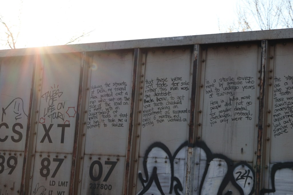 LOCAL: Painting five panels for a mural. This has been going on for a couple of weeks. The cold weather delayed the project by a week. So, I had a pencil sketch, an underlay, and then a week of downtime. I am using three large canvases, oil, and I need ventilation. [Image withheld]